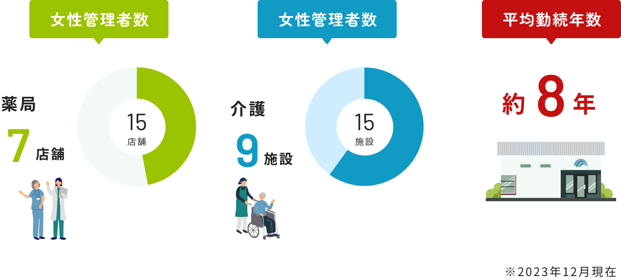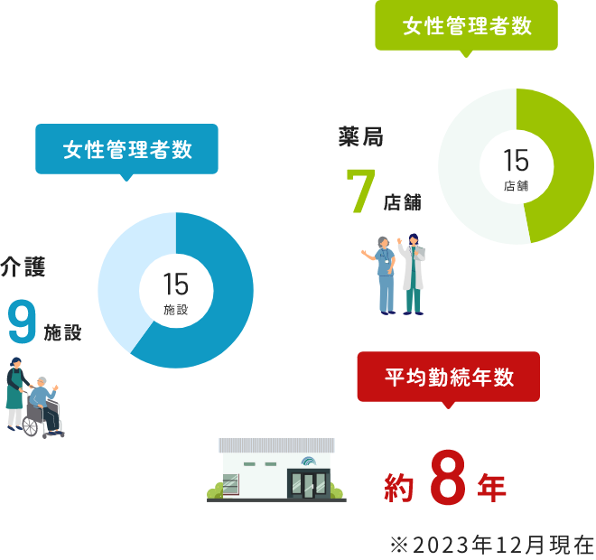 イズミでは薬剤師・介護福祉士・看護師などさまざまな職種のスタッフが活躍しています。